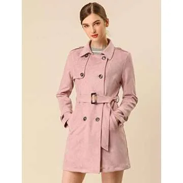 Allegra K Women's Faux Suede Trench Coat Notched Lapel Double Breasted Jacket with Belt Small Pink