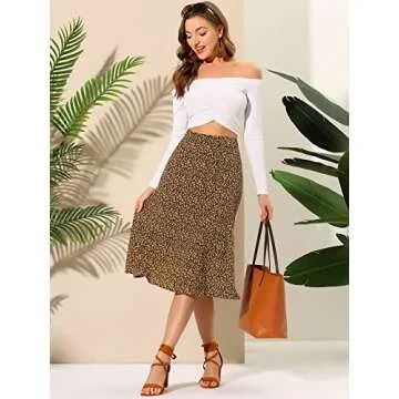 Allegra K Women's Floral Midi Skirt Peasant Elastic Waist A-Line Ditsy Leave Print Skirts Medium Black Yellow