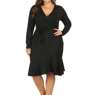 Show moreDiscover the perfect blend of elegance and comfort with the Allegrace Women Plus Size Wrap V Neck Long Sleeve Ruffle Midi Dress. Designed specifically for the curvier figure, this stunning black midi dress showcases a stylish wrap design that flatters your neckline and emphasizes your waist. The long sleeves provide lovely arm coverage, making it versatile enough for various occasions, while the ruffle detailing adds a touch of femininity and movement to your look. Crafted from soft polyester, it’s ideal for both warmer days when you want something light yet chic and breezy evenings alike. Whether you're attending a casual gathering or dressing up for a night out, this dress will be your go-to choice. Available in sizes up to 4X, you can confidently embrace your style without compromising on comfort or fit.