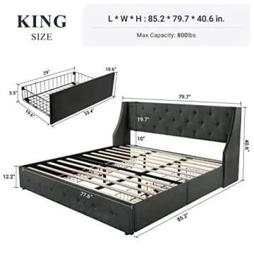 Allewie King Size Bed Frame with 4 Storage Drawers and Wingback Headboard, Button Tufted Design, No Box Spring Needed, Dark Grey