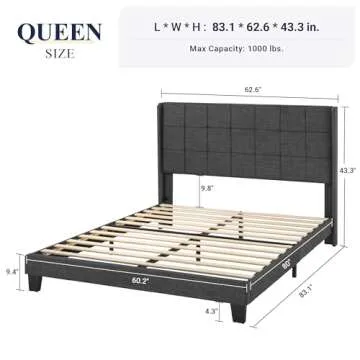 Show moreIntroducing the Allewie Queen Size Platform Bed Frame with Wingback, a stylish yet functional centerpiece for your bedroom! Designed with a chic wingback and beautifully upholstered in dark grey fabric with square-stitched detailing, this bed frame is more than just a piece of furniture; it’s an investment in your comfort and style. The durable steel framework paired with sturdy wooden slats provides exceptional support with an impressive weight capacity of 1000 lbs, making it suitable for everyone, from children to adults. Plus, with the option to forego a box spring, you can pair it with any type of mattress—be it spring, memory foam, latex, or hybrid.