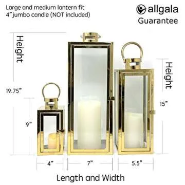 Show more Introducing the exquisite Allgala 3-pc Deluxe Jumbo Lantern Set, where elegance meets functionality. Crafted with a sturdy stainless steel frame and tempered glass panels, these lanterns bring a sleek, polished aesthetic to both indoor and outdoor settings. Imagine these stunning pieces gracing your patio during summer evenings or transforming your living room into a cozy retreat. The contemporary rectangular prism structure, accentuated by a shiny plated finish, enhances the overall appeal, making them a delightful addition to your decor.