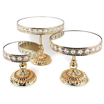 Show more Welcome to elegance with the Allgala Wedding Cake Stands 3-Piece Set! This exquisite set features a stunning gold plated metal structure adorned with sparkling acrylic crystals, offering a high reflective mirror surface that elevates any dessert display to new heights of sophistication. Perfect for capturing the attention of your guests, these stands add a touch of glamour to your special occasions. The dimensions of each stand are meticulously designed to accommodate various confections: the large stand measures 12" in diameter and 11.25" in height, while the medium and small stands are 10" and 8" in diameter, respectively, and provide versatile decorating possibilities that will enchant your guests.