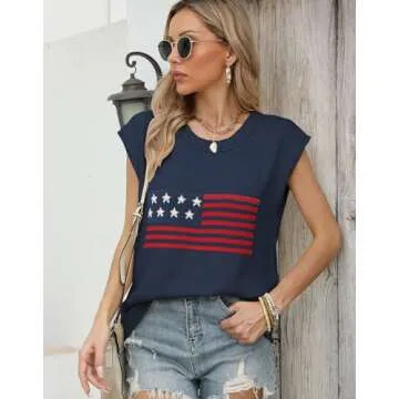 Allifewithu Women's Cap Sleeve Crew Neck Sweaters Vest American Flag Lightweight Sweaters Tops Navy Blue Large