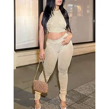 ALLUMK Womens Sexy 2 Piece Pants Outfits O Neck Sleeveless Crop Top High Waist Skinny Trousers Clubwear Apricot S