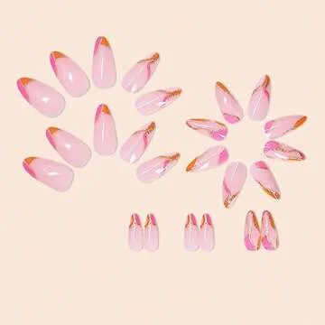 Almond Press on Nails Medium Fake Nails Orange Pink False Nails Full Cover Artificial Gold Line Design Fake Nails for Women Acrylic Stick on Nail with Adhesive Tabs 24 Pcs