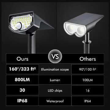 Show moreIntroducing the Aloftsun Solar Motion Sensor Spotlights, your ultimate solution for safe and stunning outdoor lighting. Designed with 30 high-quality LED chips, these spotlights provide unparalleled brightness and uniformly illuminate your yard or garden. Whether you need to brighten your walkway or enhance security around your home, these innovative lights serve a dual purpose of functionality and design. Equipped with a PIR sensor that boasts a 160° detection angle and a remarkable 33ft sensing range, rest assured that movement will trigger the lights, ensuring safety without disruption from environmental factors like wind or rain.