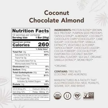 Show moreDiscover the delicious and nutritious ALOHA Organic Plant-Based Protein Bars - Chocolate Coconut Almond! Each box contains 12 generously sized bars, each weighing 1.98 ounces, packed with flavor and wholesome ingredients that support your healthy lifestyle. These protein bars feature 14 grams of USDA organic plant-based protein sourced from organic brown rice and pumpkin seeds, ensuring that you get the nourishment you need without any artificial additives. With only 4 grams of sugar, 6 grams of fiber, and no stevia or erythritol, these bars seamlessly blend taste and health in every bite.
