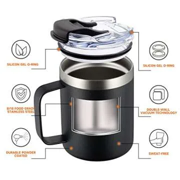 ALOUFEA 12oz Insulated Coffee Mug Cup with Handle, Stainless Steel Travel Coffee Mug with Flip Lid, Double Wall Vacuum Coffee Tumbler, Rose Gold