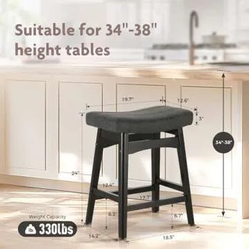 ALPHA HOME Bar Stools Set of 2, Solid Wood Saddle Kitchen Stools with Black PU Leather Cushion Counter Height Barstools with Wooden Base for Kitchen Dining Cafe, 24 Inch, Black, 2PCS