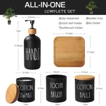 Show moreEnhance your bathroom aesthetics and organization with the ALPIRIRAL Matte Black Bathroom Accessories Set. This thoughtfully curated set includes everything you need to create a cohesive and stylish bathroom atmosphere, featuring a soap dispenser, toothbrush holder, Q-tip holder, cotton ball holder with charming bamboo lids, and a stunning bamboo tray. Perfectly marrying functionality and rustic appeal, this set elevates your personal space with a design that resonates with farmhouse chic and boho vibes.