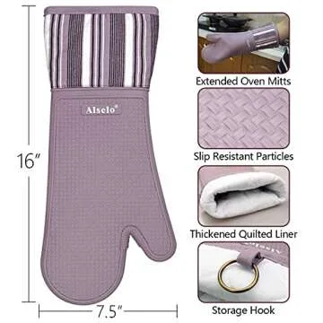 Show more Introducing the Alselo Silicone Oven Mitts - your ultimate kitchen companion designed to keep you safe while you cook, bake, or grill! With an extra-long length of 7.5” x 16”, these mitts provide unparalleled protection for your hands and forearms, ensuring that you can handle hot pots, pans, and grills with confidence. Available in a vibrant purple color, these mitts not only enhance your kitchen aesthetics but also elevate your cooking experience, making every culinary task easier and safer.