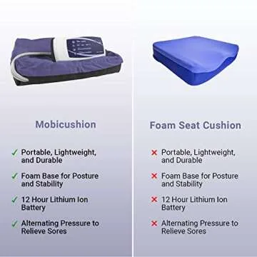 Show more The Mobi Cushion is an advanced pneumatic seat cushion that redefines comfort and safety for individuals needing prolonged sitting assistance. With its innovative design, this cushion utilizes a consistent cycle of alternating low air pressure that flows through its air cells, ensuring that everyone can enjoy hours of comfortable seating without the discomfort of pressure sores. Whether you're in a wheelchair or sitting at home, the Mobi Cushion promises unparalleled comfort.