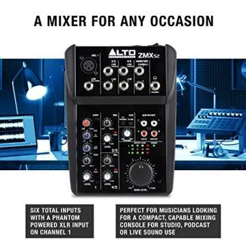 Show more The Alto ZMX52 is your ultimate compact mixer for any occasion! Designed with musicians and podcasters in mind, this versatile mixing console offers a plethora of features while maintaining the ease of use that novices and professionals alike appreciate. With a total of six inputs, including a phantom powered XLR input on channel 1, it can handle everything from studio recordings to live sound sessions.