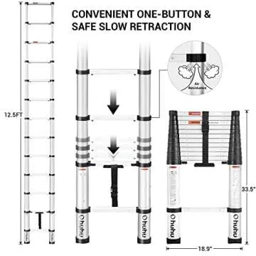 Crafted from a high-quality aluminum alloy, the Ohuhu telescoping ladder features more than 60% overlapping on each casing tube, which provides unmatched stability, supporting up to 250 lbs comfortably. Each rung is engineered to reduce safety risks with intelligent locking pins that prevent accidental sliding and allow for smooth extension and retraction. Say goodbye to pinched fingers thanks to the ladder's innovative one-button retraction system—all you need to do is push down on the thumb buttons, and watch the ladder retract smoothly and effortlessly.