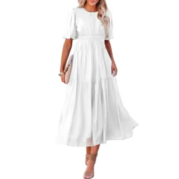 Show more Meet the stunning AlvaQ White Dress for Women, an exceptional fusion of elegance and comfort tailored for summer and fall. This casual high-waisted A-line pleated sundress is made from 100% Polyester, ensuring a soft, breathable experience that feels as delightful as it looks. Designed with a traditional crew neckline and charming puff sleeves, this dress adds a playful yet elegant silhouette to your wardrobe, suitable for various occasions. The stretchy smocked design highlights your figure, creating a flattering fit while allowing ample freedom of movement in the flowy skirt.