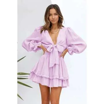 AlvaQ Women Dresses Summer 2025 Deep V Neck Tie Front Long Sleeve Ruffle Mini Dress
