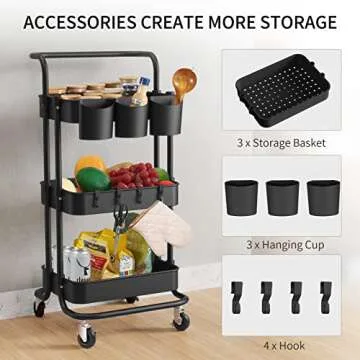 This versatile rolling cart offers a spacious 3-tier storage capacity, making it an excellent choice for maximizing your space. With plenty of room for kitchen supplies, craft materials, or bathroom essentials, the ALVOROG cart includes 3 hanging cups and 4 hooks to keep everything organized and easily accessible. Say goodbye to clutter and hello to streamlined efficiency with this innovative storage solution.