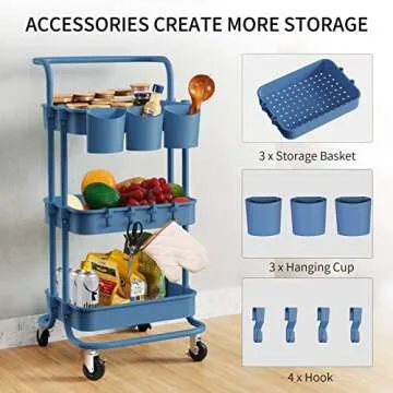 alvorog 3-Tier Rolling Utility Cart Storage Shelves Multifunction Storage Trolley Service Cart with Mesh Basket Handles and Wheels Easy Assembly for Bathroom, Kitchen, Office (Color Navy Blue)