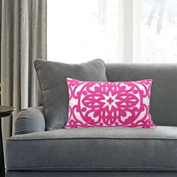 Alysheer Embroidered Lumbar Decorative Throw Pillow Cover 12"x 20", Classic Boho Mandala Embroidery Pattern Cotton Rectangular Cushion Case for Sofa Couch Living Room Bedroom(Bright Hot Pink)