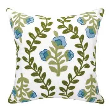 Alysheer Floral Embroidered Summer Decorative Throw Pillow Cover 18"x 18", Farmhouse Cottage Blue Flowers Green Leaves Knit Pattern Cotton Canvas Cushion Case for Sofa Couch Bed Living Room Decor