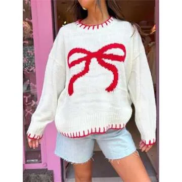 Alyweatry Women Coquette Cute Sweater with Bows Long Sleeve Crew Neck Aesthetic Y2k Loose Fit Knit Sweater (White, M)