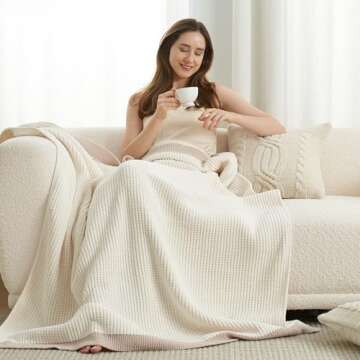 Show more Introducing the **Amélie Home Chenille Waffle Throw Blanket**, the epitome of comfort and style, designed for those who appreciate a blend of luxury and practicality. Measuring a generous 50 x 60 inches, this reversible blanket is crafted from high-quality, ultra-soft chenille that's non-shedding and skin-friendly, promising an incredibly plush experience whether you're lounging on the couch or curling up in bed. One side features a classic cozy waffle knit, perfect for traditional settings, while the other showcases a stylish ribbed design, offering an elegant twist to your home décor. Plus, this blanket is lightweight yet warm, making it a perfect companion for all seasons.