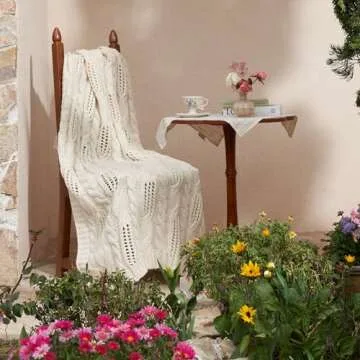 Amélie Home White Cable Knit Throw Blankets Soft Cozy Lightweight and Breathable Hollow Out Knit Throw Blankets for Spring Summer Chunky Wool Farmhouse Knitted Throw for Couch Sofa Bedroom 50'' x 60''