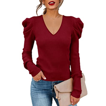 Amarmia Women's Long Puff Sleeve Knit Pullover Sweater V Neck Ribbed Top Red