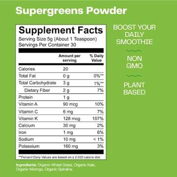 Show more Discover the rejuvenating power of Amazing Grass Super Greens, a meticulously crafted superfood powder designed to enhance your overall health and wellness. This incredible blend of organic ingredients is an effortless way to boost your daily nutrition while delivering key nutrients, minerals, and the natural benefits of chlorophyll. Packed with four powerhouse superfoods, including chlorophyll-rich wheat grass, kale loaded with vitamins A and K, nutrient-dense moringa, and protein-packed spirulina, this Super Greens Powder is your best companion for a healthful life.