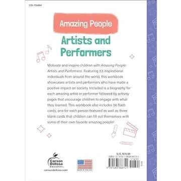 Show more Introducing a vibrant and engaging educational resource that dives deep into the lives of 53 extraordinary artists and performers. This book is perfectly designed for young learners, combining comprehensive reading passages with a variety of interactive activities. Each section allows students to not only learn about the featured icons but also to relate their lessons to their own lives, fostering a connection between history and personal experience.