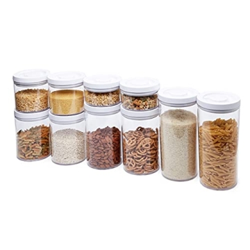 Show more Introducing the Amazon Basics 10-Piece Round Airtight Food Storage Containers, the perfect solution to keep your dry goods fresh longer! Designed with functionality and convenience in mind, this versatile set is ideal for storing sugar, coffee, cereals, and a wide variety of other pantry staples. Each container is made of high-quality, BPA-free plastic, ensuring both durability and food safety. With a clear body and crisp white lids, these containers not only keep your food fresh but also allow you to easily view the contents inside, making pantry organization a breeze.