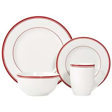 Show more Introducing the Amazon Basics 16-Piece Cafe Stripe Kitchen Dinnerware Set, a perfect blend of elegance and functionality designed for your modern kitchen. This beautifully crafted dinnerware set includes a full service for four, making it an ideal choice for both everyday meals and special occasions. Made from AB-grade porcelain, it is not only aesthetically pleasing but also lightweight and durable, ensuring that it withstands the rigors of daily use. The stunning white finish complemented by contemporary red trim adds a chic flair to your dining experience, making every meal feel special.