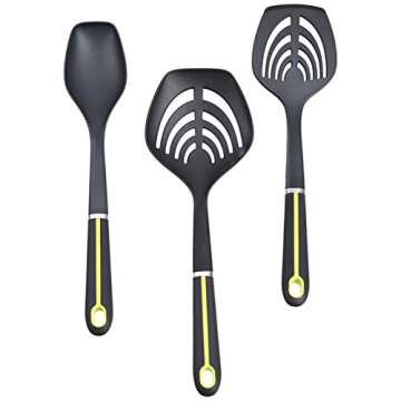 Includes slotted turner, slotted spoon, basting spoon, can opener, tongs, measuring cups and spoons, grater, peeler, and whisk