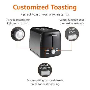 Show more Introducing the Amazon Basics 2 Slice Toaster, a perfect fusion of style and functionality that transforms your breakfast routine. Designed for ease and efficiency, this toaster features an impressive 7 precise browning settings, allowing you to achieve your desired toast texture every time. Say goodbye to uneven toasting, as this reliable appliance is crafted to toast evenly and consistently, catering to different preferences within your family.
