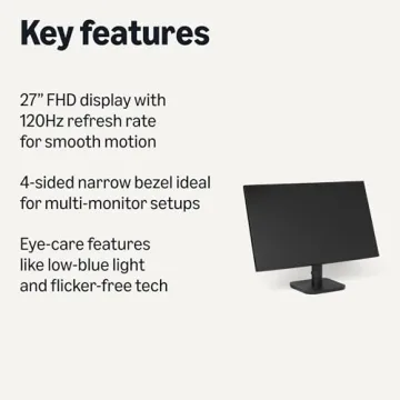 Show moreThe Amazon Basics 27-inch Computer Monitor is a top-of-the-line display that combines exceptional performance with stunning visuals, making it perfect for both home and office use. Featuring a vibrant FHD resolution of 1920x1080 and an impressive 99% sRGB color coverage, this monitor ensures that every image is displayed with lifelike clarity and accuracy. Designed for the modern user, it boasts a sleek 4-sided narrow bezel design, allowing for a more immersive viewing experience and perfect for creating multi-monitor setups. With a refresh rate of 120Hz and Adaptive Sync technology, this monitor drastically reduces lag and motion blur, providing a smooth visual experience whether you're gaming, streaming, or working on important tasks.