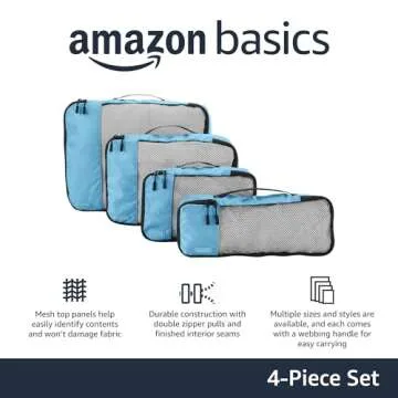Set includes 1 large (17.5 x 12.75 x 3.25 inches), medium (13.75 x 9.75 x 3 inches), small (11 x 6.75 x 3 inches), and slim (14 x 5 x 2.8 inches) Amazon Basics packing cube