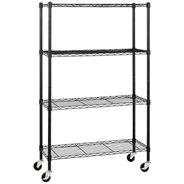 Show more Introducing the Amazon Basics 4-Shelf Adjustable Heavy Duty Steel Wire Rack Storage Shelving Organizer - your answer to clutter and disorganization! Engineered for performance, this shelving unit features a robust steel construction with a sleek matte black finish that adds a touch of elegance to any space. Designed to accommodate up to 350 pounds per shelf and a total of 1400 pounds with leveling feet, it promises to hold even the heaviest of your items with ease. Whether you're enhancing your kitchen, garage, laundry room, or playroom, this shelving unit adapts to your needs with its adjustable height shelves, allowing you to customize the spacing in 1-inch increments according to your storage requirements.