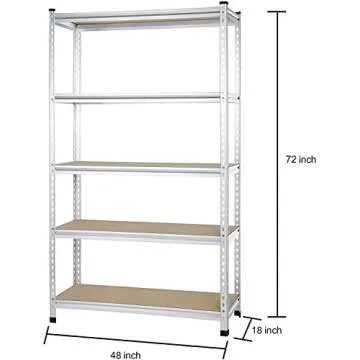 Show moreIntroducing the Amazon Basics 5-tier Medium Duty Storage Shelving Unit, your ultimate solution for organizing any space, be it a kitchen, office, garage, or workshop. This durable shelving unit boasts a robust aluminum construction with a sleek anodized finish that not only enhances its longevity but also adds a touch of elegance to your settings. With a generous dimension of 48 x 18 x 72 inches, it maximizes your vertical storage without taking up too much floor space. Each shelf is capable of holding up to 800 pounds, allowing for a total weight capacity of 4000 pounds when weight is evenly distributed, making it an ideal choice for both heavy-duty and everyday items.