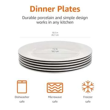 Show moreIntroducing the Amazon Basics 6-Piece White Dinner Plate Set - your perfect dining companion that combines functionality with elegance. Crafted from durable AB-grade porcelain, these plates boast a beautiful white finish that effortlessly enhances any table setting, whether for casual meals or special occasions. Each plate has a generous diameter of 10.5 inches, making them perfect for serving your favorite dishes. Designed for the modern home, these plates are microwave, oven, and freezer safe, allowing you to enjoy unparalleled versatility in your kitchen. Their resilience against temperatures ranging from 5 to 572 degrees F ensures you can cook or reheat with confidence. Plus, their dishwasher-safe design makes cleanup a breeze, so you can spend more time enjoying your meals and less time on chores.