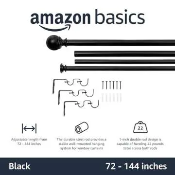 Amazon Basics Adjustable Curtain Rods for Windows, Round Finials, 1-Inch Double, 72" to 144", Black, Pack of 1