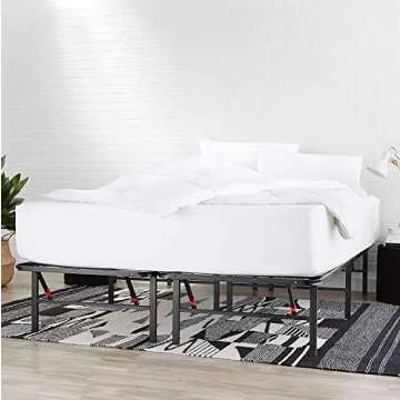 Show more This durable king bed frame from Amazon Basics is an epitome of strength and convenience, allowing you to enhance your bedroom setup like never before. With a sturdy metal construction, it is designed to support various mattress sizes, including King and California King, without the need for a box spring. Imagine transforming your sleeping space with a solid structure that not only ensures a comfortable night's sleep but also provides peace of mind. Its noise-free design ensures that when you turn or shift in bed, you won't wake up to creaks and groans, creating an oasis of comfort in your home.