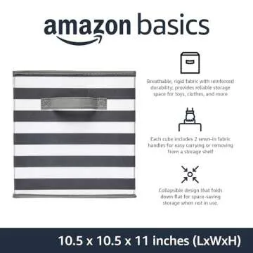 Amazon Basics Cube Organizer Storage Bins Handles, Collapsible Fabric, Pack of 6, 10.5"x10.5"x11", White/ Light Grey Stripe