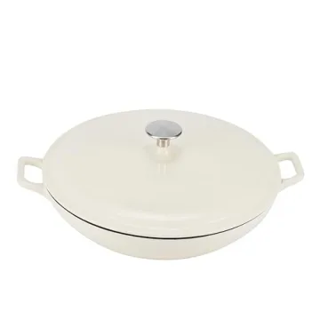 Show more Introducing the exquisite casserole cast iron skillet in a stunning white finish, designed to elevate your cooking experience. This versatile and functional piece of cookware features loop side handles that ensure seamless transport from stove to table. The skillet is oven safe up to 500 degrees F, making it perfect for a variety of recipes, from savory roasts to delightful desserts. Crafted from durable cast iron, it guarantees even heat distribution and retention, allowing you to create impeccably cooked meals every time.