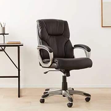 Show more Step into the world of comfort and elegance with the Amazon Basics Executive Home Office Desk Chair. Perfectly designed for both the professional office environment and the comfort of your home workspace, this chair marries functionality with style. The sleek black and silver finish exudes sophistication, making it an excellent addition to any room, whether it's an office or a conference area. This chair offers more than just aesthetic appeal; the bonded leather upholstery is not only visually impressive but also easy to clean, ensuring your chair remains pristine even with regular use.