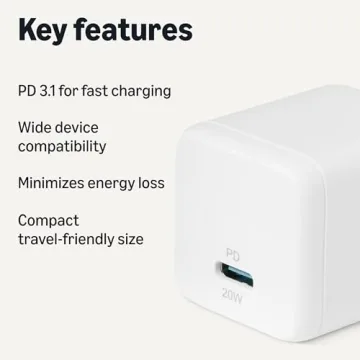 Show moreIntroducing the Amazon Basics Fast Charging USB C Nano GaN Wall Charger, your top solution for efficient and rapid charging! This compact yet powerful charger boasts a remarkable 20-watt output, utilizing cutting-edge GaN technology to minimize heat while maximizing speed. Designed with a single USB-C port and PD 3.1 support, this charger ensures your devices—whether they are smartphones like iPhone and Samsung, or tablets including iPad and MacBook Air—receive a swift charge without the worry of overheating.