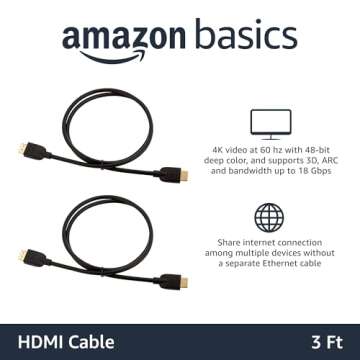 Discover the ultimate solution for connecting your devices with the Amazon Basics HDMI Cable, 2-Pack. Designed to provide unmatched performance, this 3-foot cable boasts a remarkable capability to support 4K video at 60Hz. Whether you’re streaming your favorite movies or gaming at high-resolution, this HDMI cable ensures a crisp and clear picture every time. With a bandwidth of 18Gbps and 48-bit color depth, you'll enjoy stunning visuals that bring your...