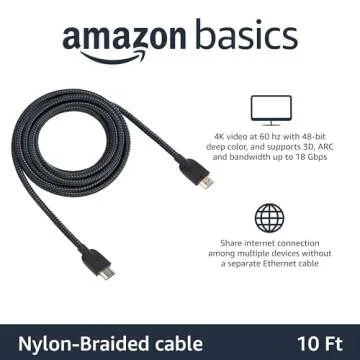 Show more The Amazon Basics Nylon Braided HDMI Cable is an exceptional accessory designed for connecting your HDMI-enabled devices with utmost convenience and quality. Whether you're setting up your home theater system or simply connecting your laptop to a TV, this 10-foot cable provides both flexibility and performance like no other.