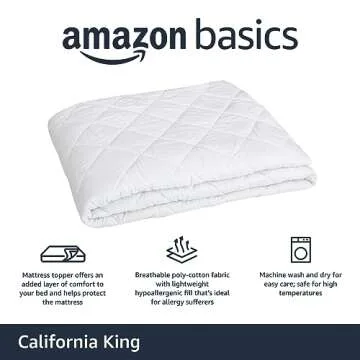 Show more The Amazon Basics Hypoallergenic Quilted Mattress Topper Pad is more than just a simple bedding accessory; it’s an essential upgrade that brings unparalleled comfort and protection to your sleeping environment. With its generous California King size of 83.9 x 71.7 x 17.7 inches, this topper promises an ideal fit for your mattress, enhancing your sleep experience. Crafted from a lightweight poly-cotton fabric, it strikes the perfect balance between breathability and softness, making it suitable for all types of sleepers who crave that plush feel. Moreover, its hypoallergenic fill caters to allergy sufferers and those with sensitive skin, ensuring a peaceful slumber without worrying about irritants.