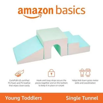 Show moreThe Amazon Basics Kids Soft Play Single Tunnel in a vibrant mix of mint, turquoise, and grey is the perfect addition to any child’s indoor play area. Designed specifically for young toddlers and children, this tunnel transforms any space into an exciting adventure zone, whether at home, in a daycare center, or at preschool. Made of a combination of CertiPUR-US certified PU foam and durable PU leather fabric, it guarantees a soft yet sturdy environment for your little ones to crawl, explore, and imagine. With secure connections using interlocking hook-and-loop strips, the tunnel stays in place during play, providing both safety and stability. Plus, its easy-to-clean surface makes maintenance a breeze, allowing more time for play and less for cleanup!